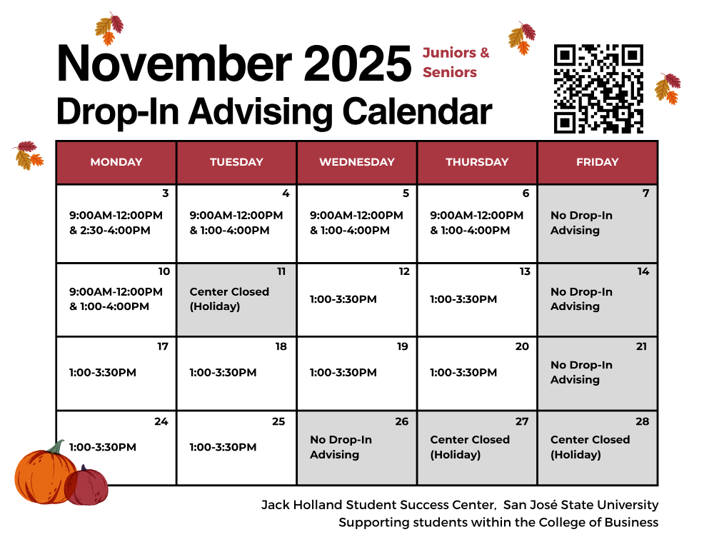 Upper Division Students (those who have completed 60 or more units) can visit the Jack Holland Success Center in the Boccardo Business Complex 008 for support.